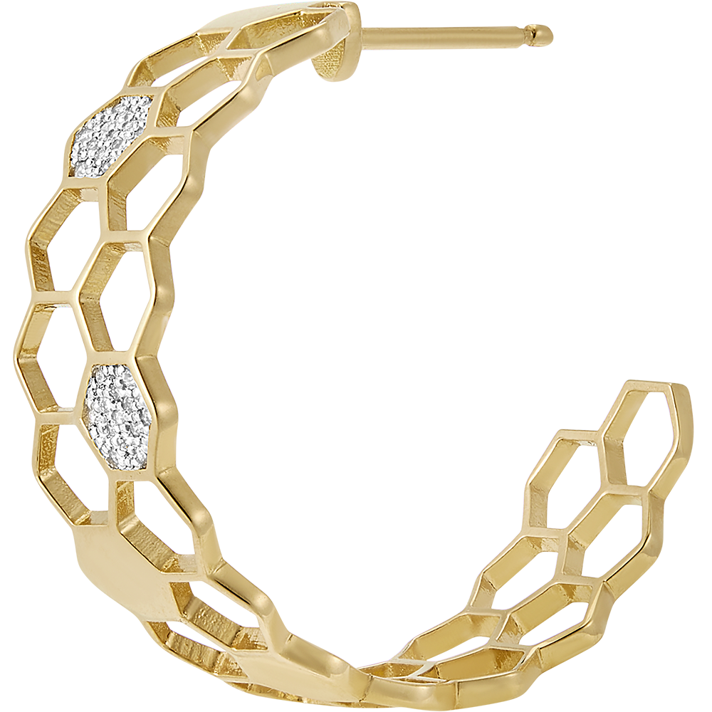The Revelation hoops are stunning pieces of jewelry that beautifully capture the precious craftmanship of bees. Their two rows of finely worked honeycomb cells are adorned with 7 solid honeycomb cells and 2 cells delicately set with 26 dazzling diamonds, exuding elegance and poetry that will elevate your outfit any occasion.