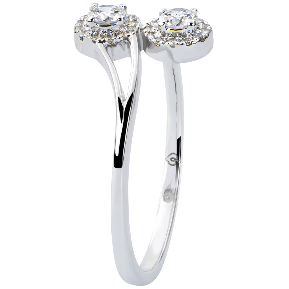 The simmetrical reflection of two round diamonds, surrounded by a diamond halo, for this feminine, symbolic ring.