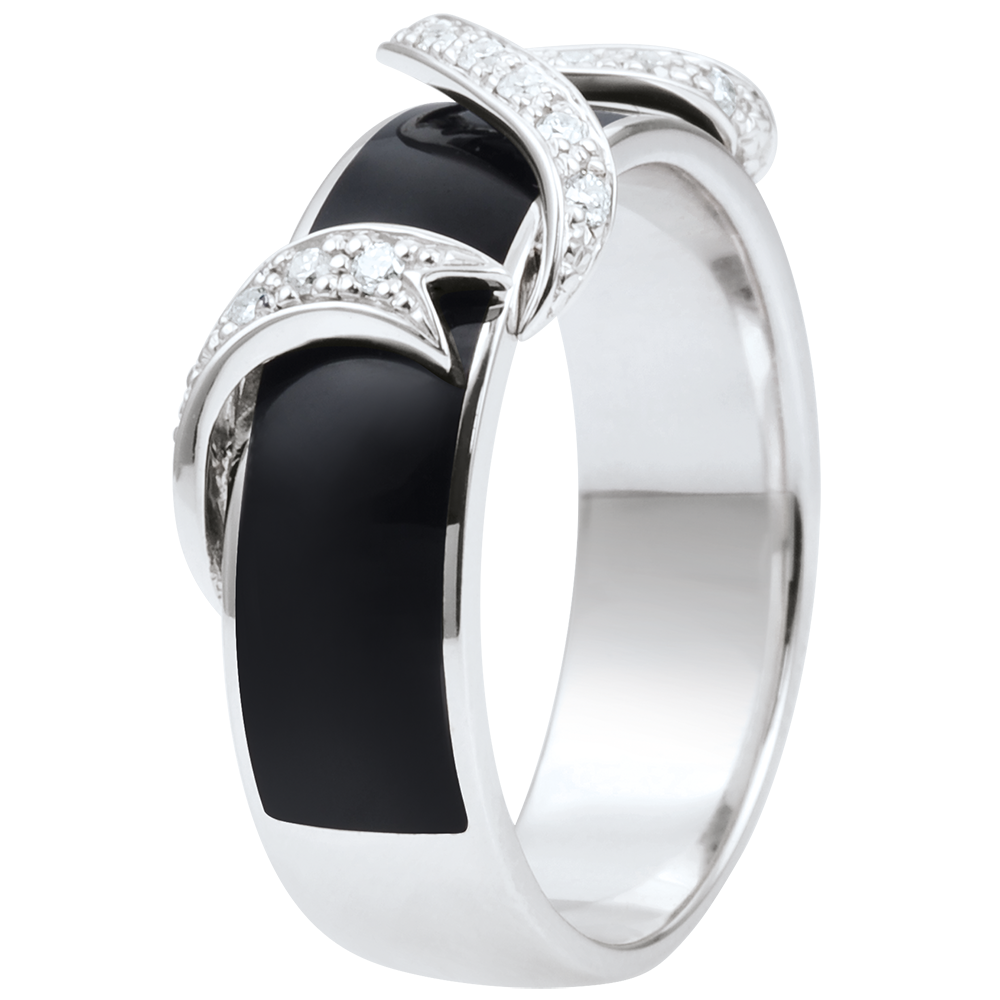 A broad band of white gold filled with black lacquer is covered by a delicate white gold ribbon richly paved with diamonds. Elegance in its purest