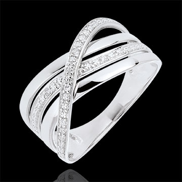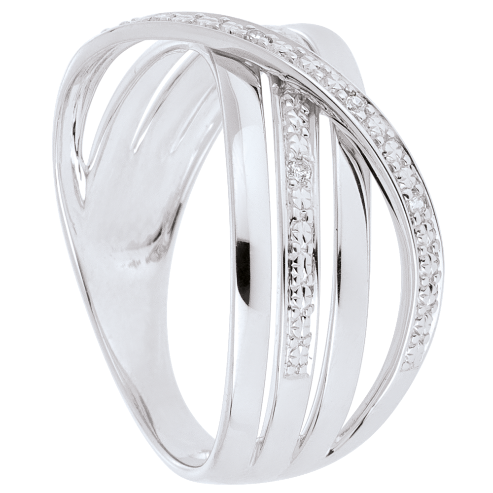 A triple white gold band is crossed by a wave of diamonds