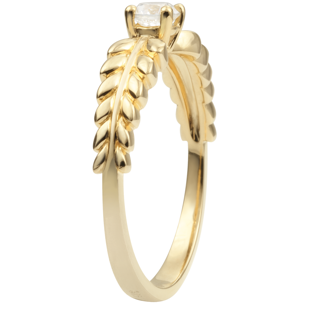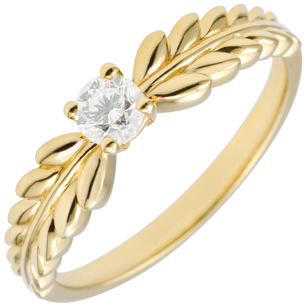 A rich golden yellow foliage shields a sublime solitaire diamond. An engagementring ring colored with freshness and modernity