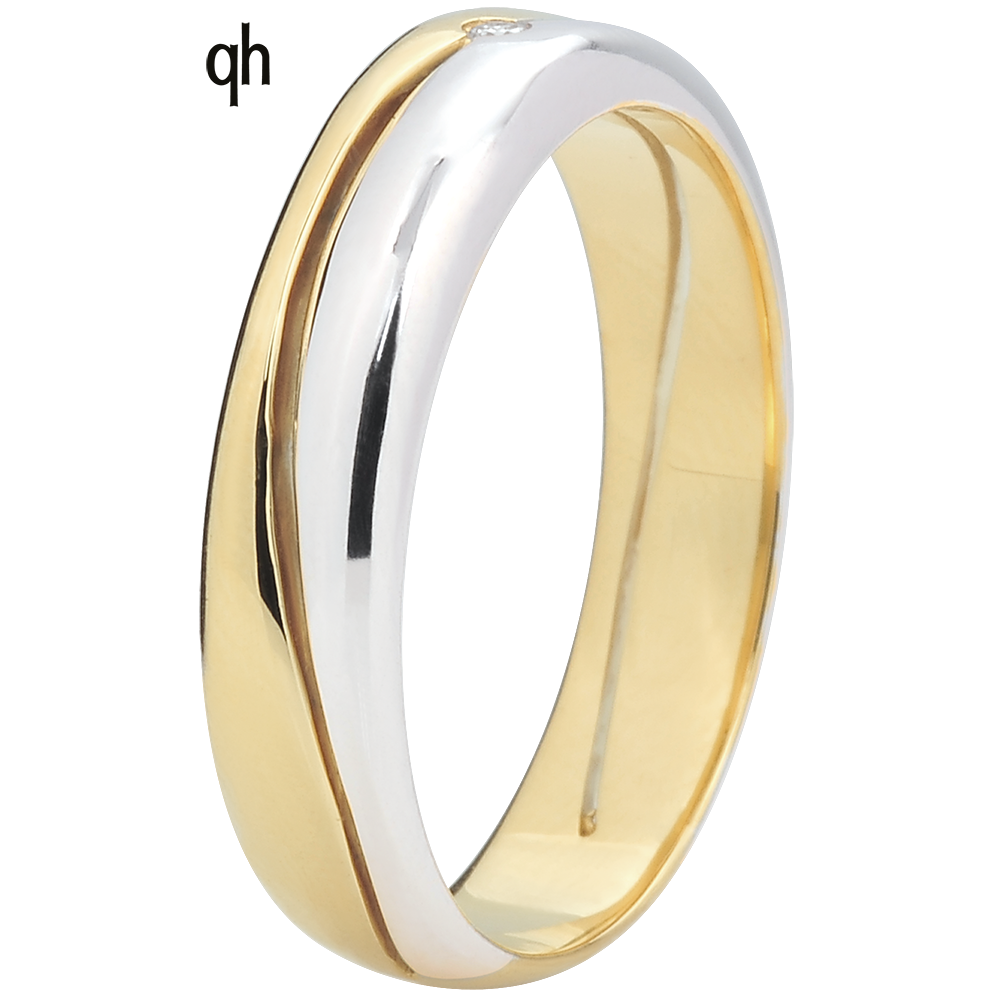 A large white and yellow gold ring is furrowed by a smooth curve. A diamond sparkle in the center of the ring.