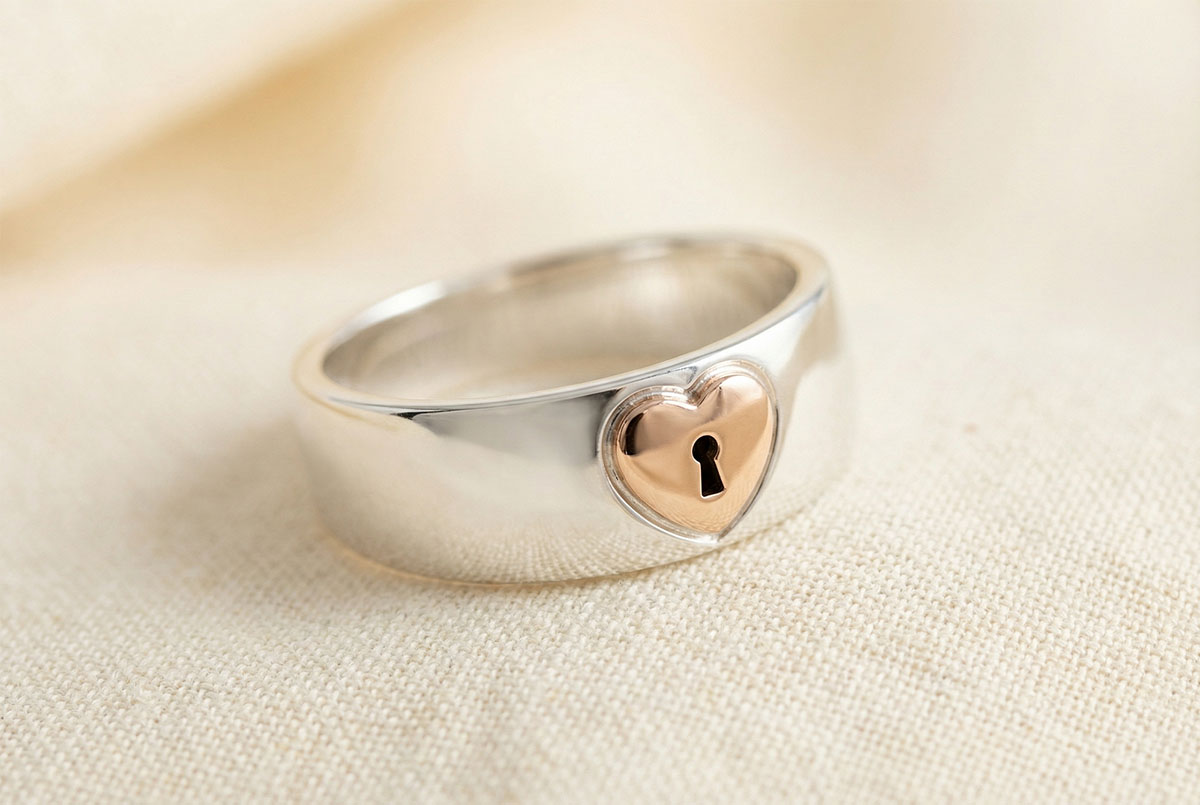 A heart in rose gold bearing a lock on a broad white gold setting.