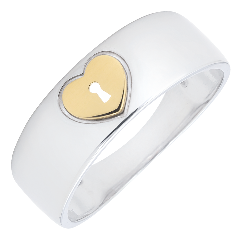 A heart in yellow gold bearing a lock on a broad white gold setting.