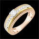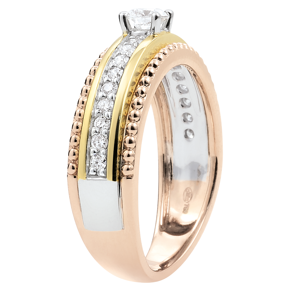 A solitaire diamond is supported by two rows of golden pearls framing a diamond ring. A 3 golds ring that imposes its brilliant and elegant femininity. 19 diamonds : 0.38 carat - Three golds (9K Gold = 375/-): 3.5 g. More dimensions