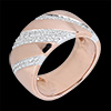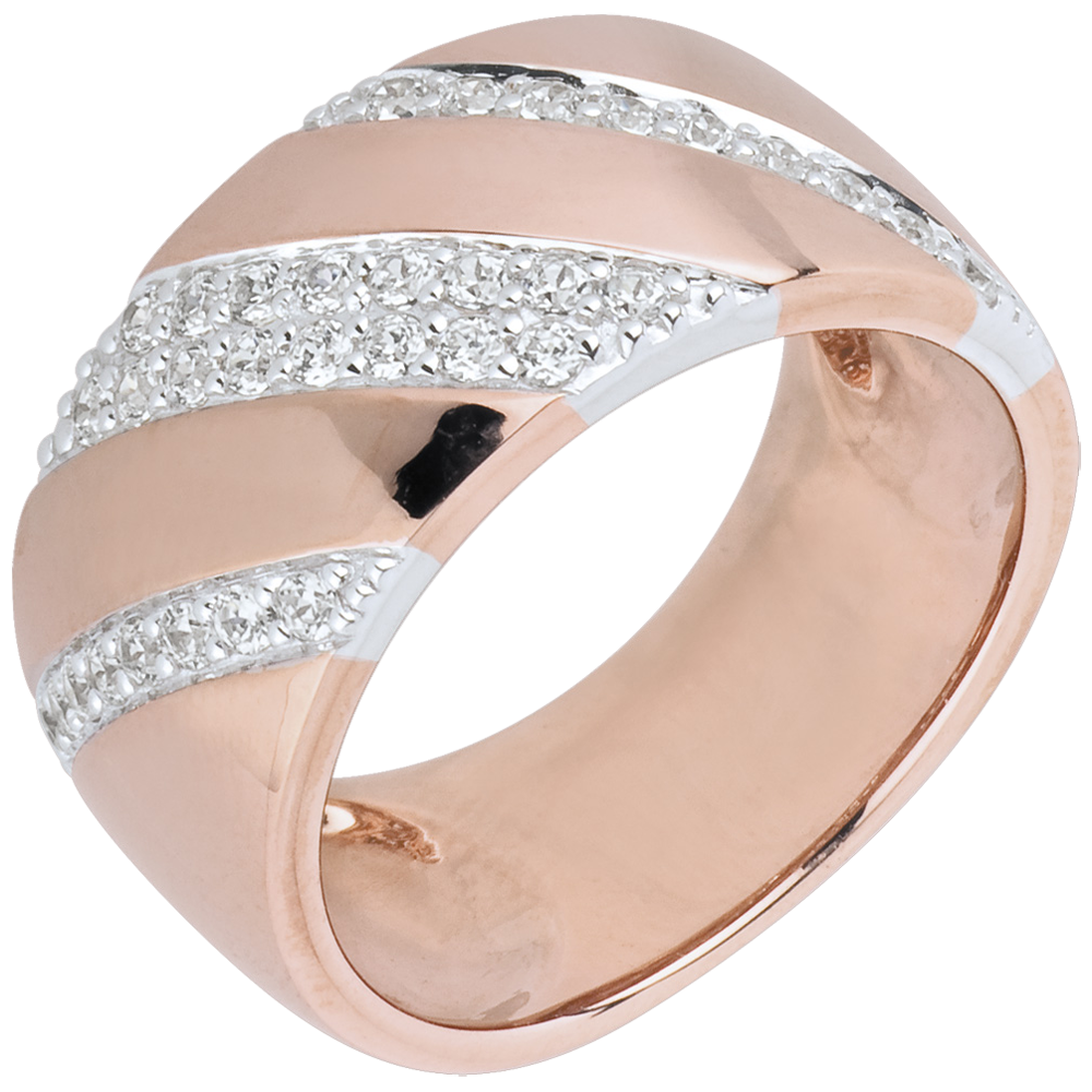 A large rose gold ring crossed with bands of white gold paved with brilliant cut diamonds to create a multi stone ring.
