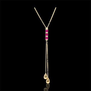Two gold tear-drops hang from the chains of a trilogy of rubies. Venetian chain links.