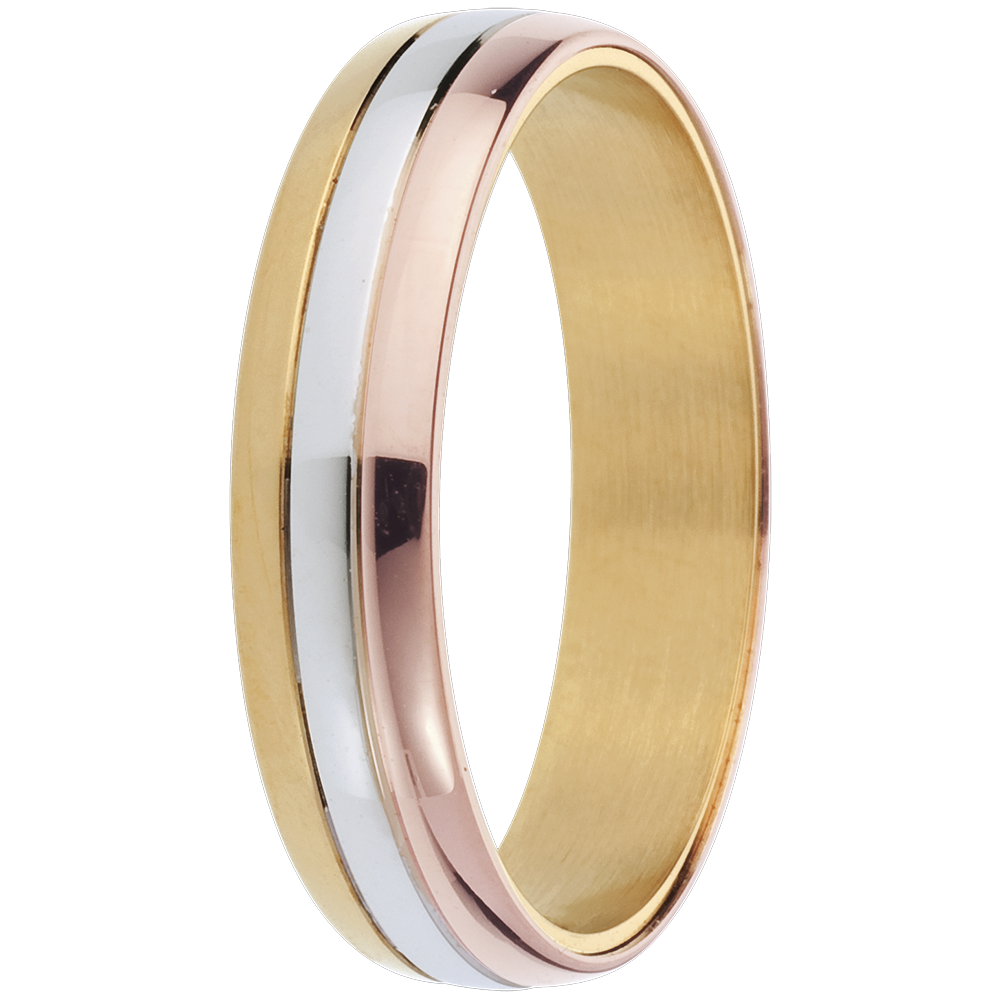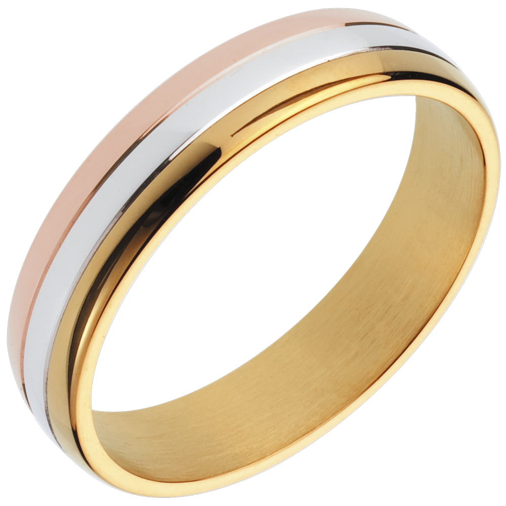 Three rings of pink, white and yellow gold unite to sit elegantly on your finger.
