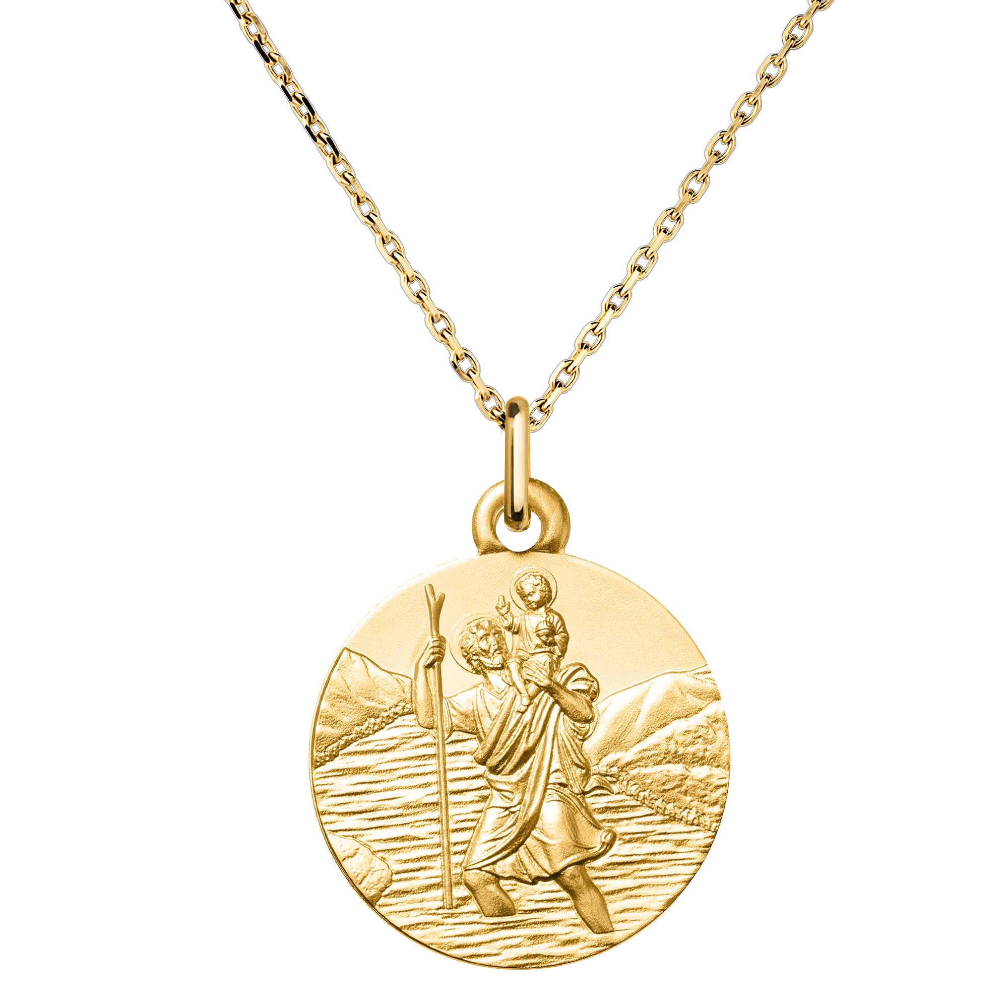 This 9 carat yellow gold medal depicts Saint Christopher carrying the Infant Jesus on his shoulders, crossing turbulent waters with faith and determination. The finely engraved sandblasted relief on the 18 mm round medal symbolizes protection and devotion.