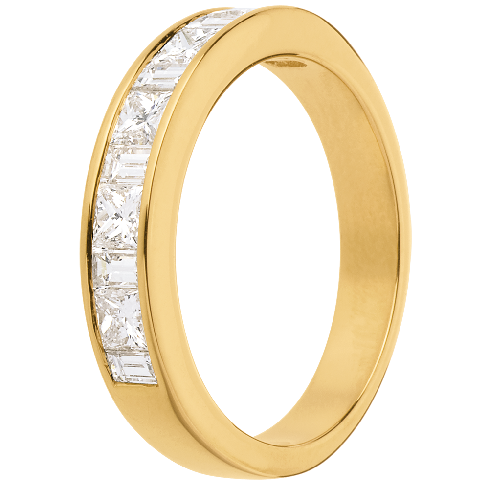A semi-paved ring with squared off princess and baguette cut diamonds in a channel setting.