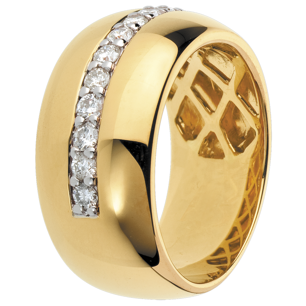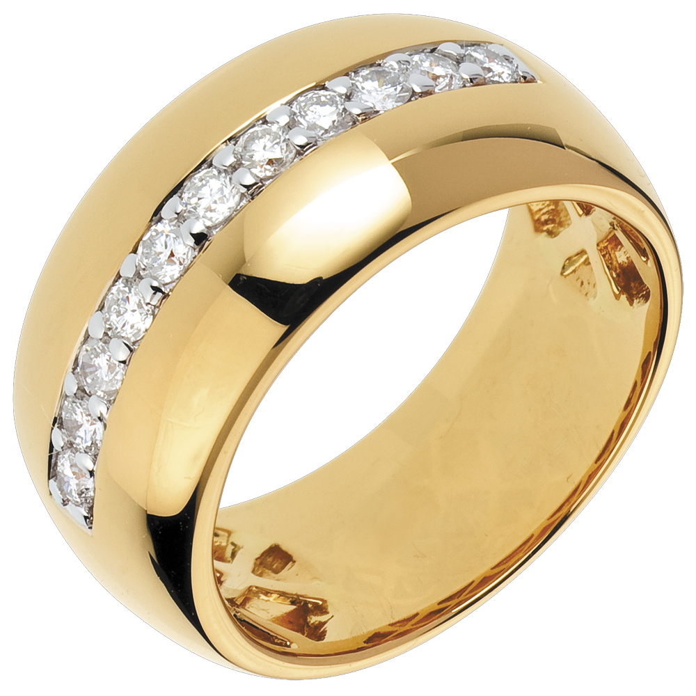 Luxurious and scintillating, subtle and elegant: this large yellow gold ring is lined with a ring of diamonds. A multi stone beauty.
