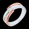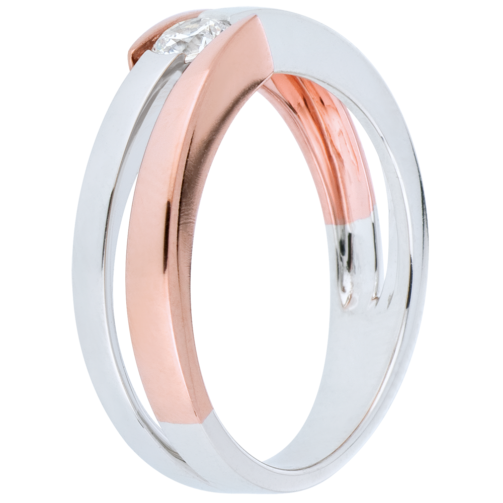 A solitaire diamond is set in a white gold ring with two entwined rose gold arms