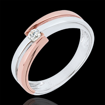 A solitaire diamond is set in a white gold ring with two entwined rose gold arms