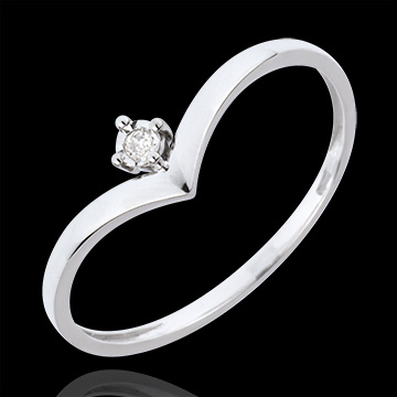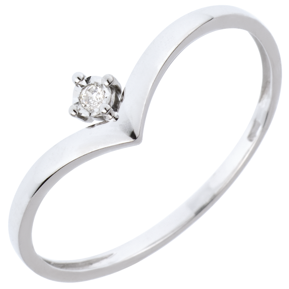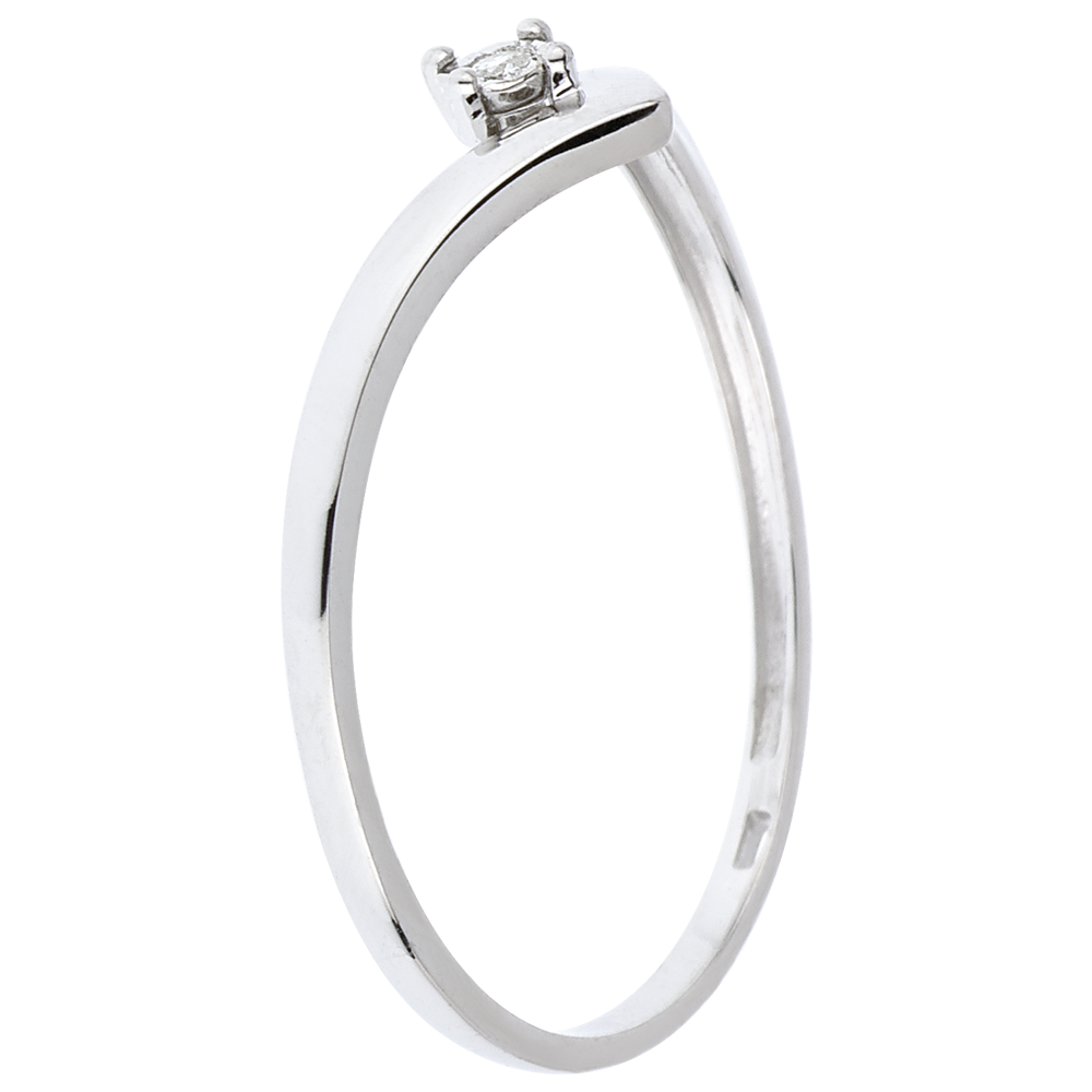 A delicate 0.01 ct diamond is gently held by four claws, resting on an 18K white gold band shaped like a precious jewel box.