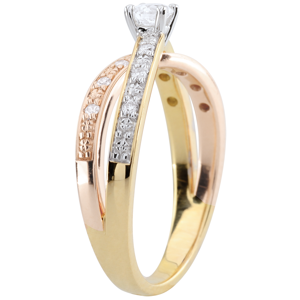 A unique combination of three golds on a pair of diamond encrusted curves to bring this sublime solitaire to heaven