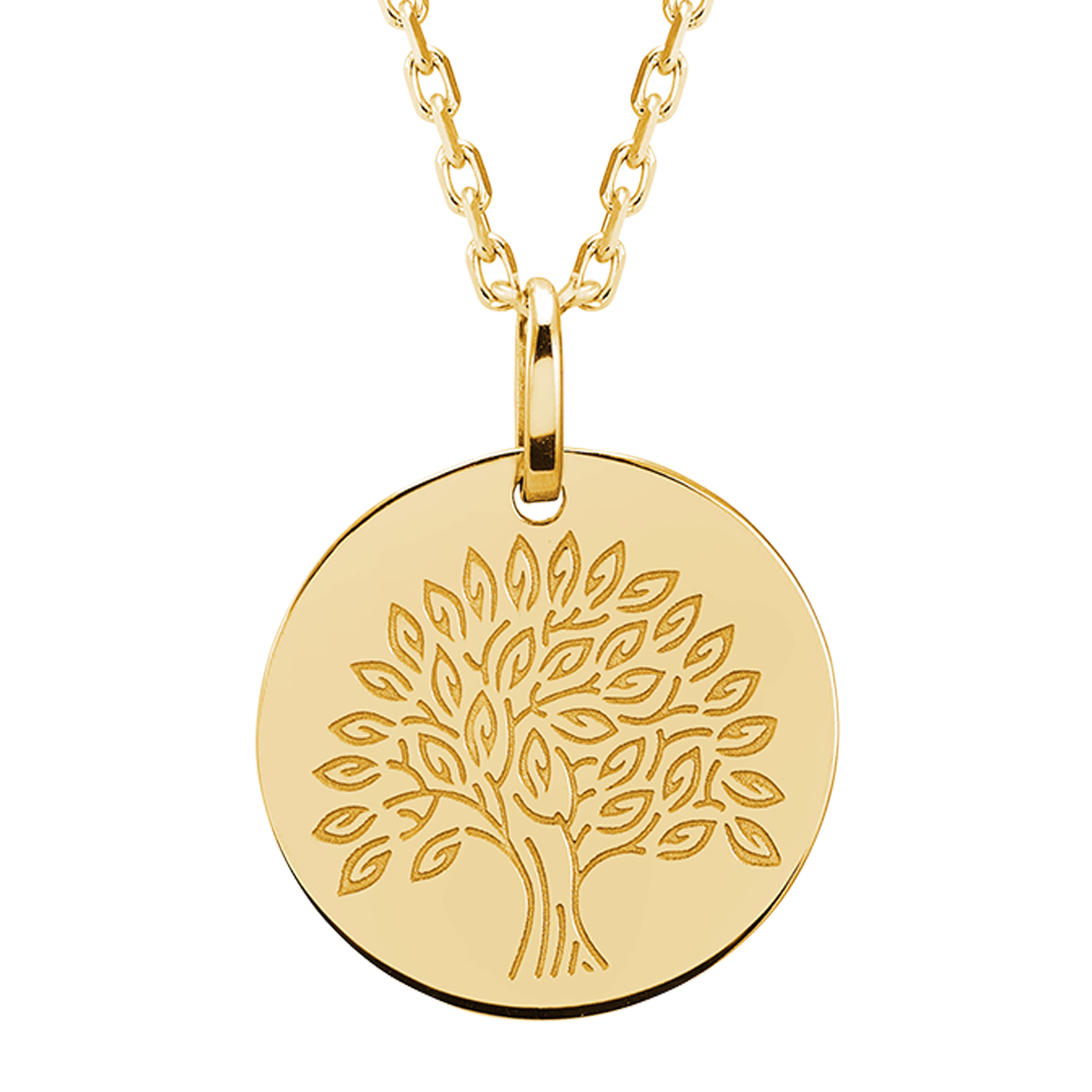 Discover this delicate Tree of Life medal crafted in 9 carat yellow gold by Edenly. Its round shape highlights a finely engraved motif, perfect for a meaningful gift. This pendant from the Origin Collection embodies pure lines and timeless elegance. Lightweight and comfortable, it can be worn daily as a personal talisman. The medal is offered with free engraving, allowing a unique personalization to mark a special occasion or memory.… See more Technical information