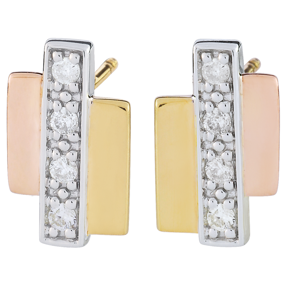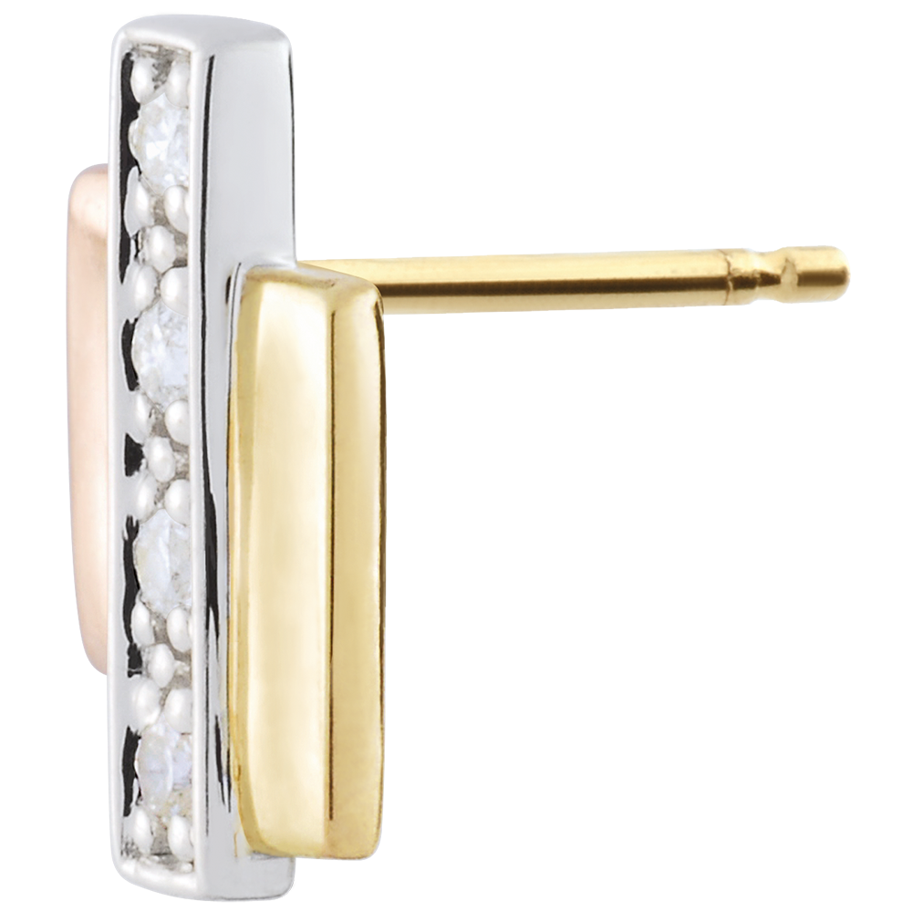 The contemporary creative combination of a white gold bar, a yellow gold bar and a rose gold bar, mounted together makes these stud earrings original and elegant.