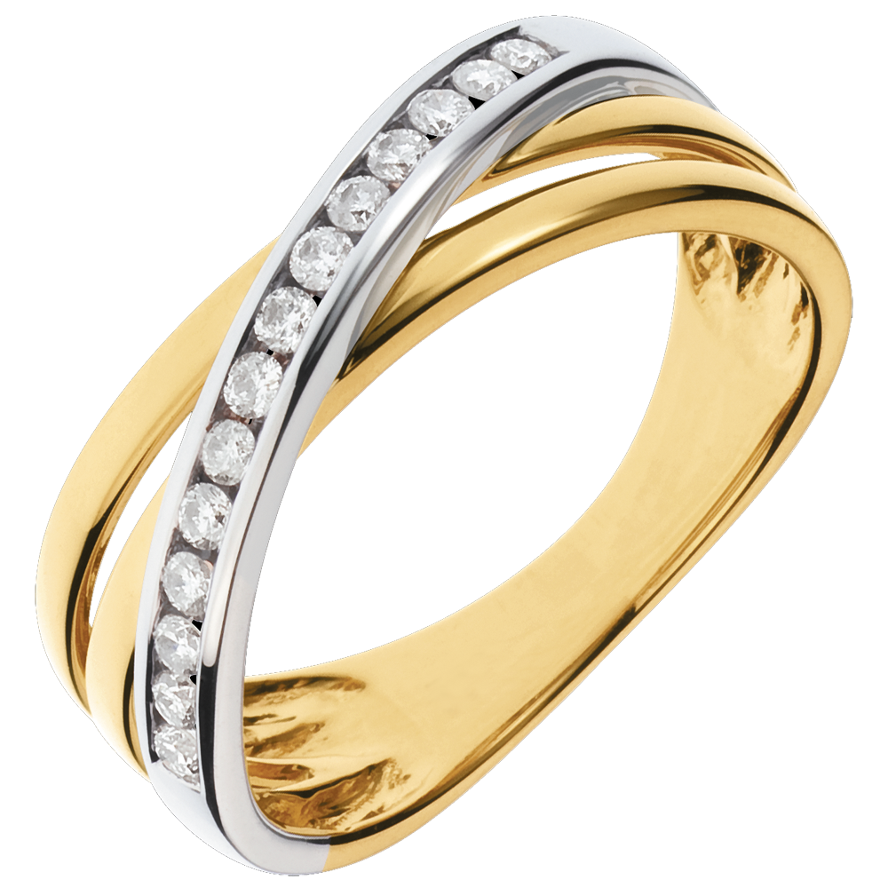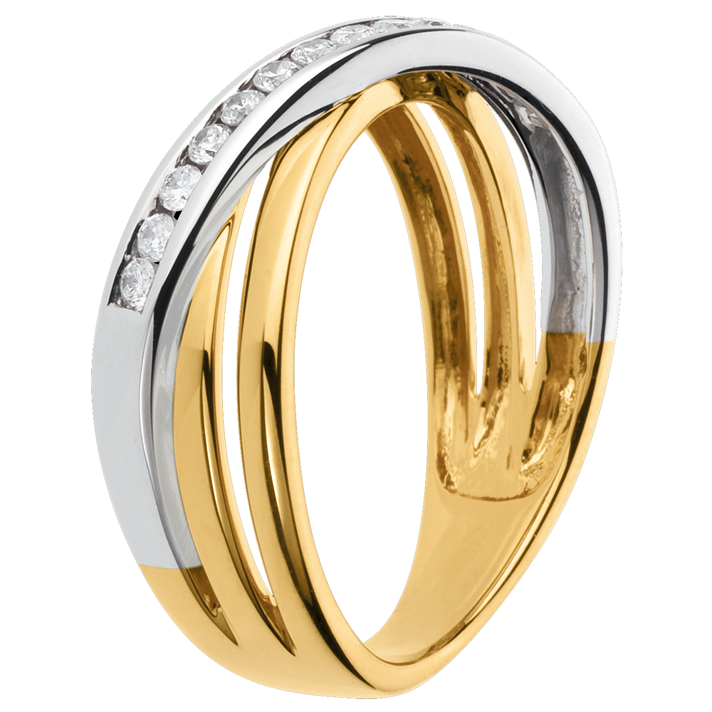 A trifecta of yellow gold and bejewelled white gold ellipses make for a wedding ring in perfect harmony.