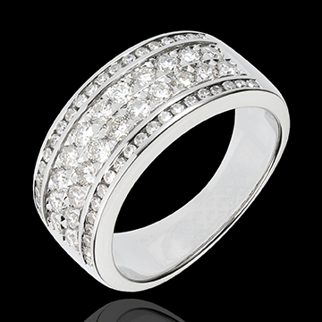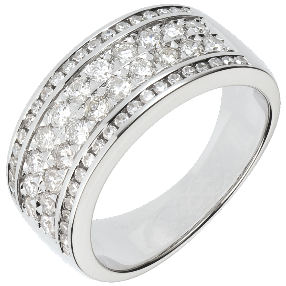 Sublime Elegance for a ring with four rows of diamonds on white gold, in which the different sizes of this multi stone wonder underline its sophistication.