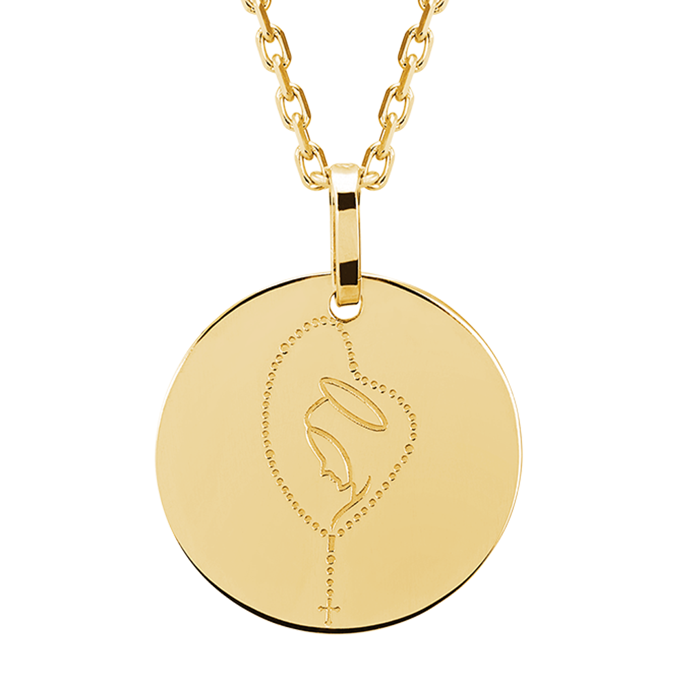 A medal of the Virgin delicately drawn by Edenly and symbolically placed in the heart of a rosary.