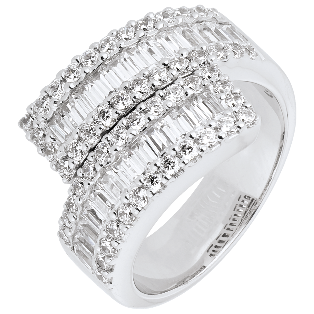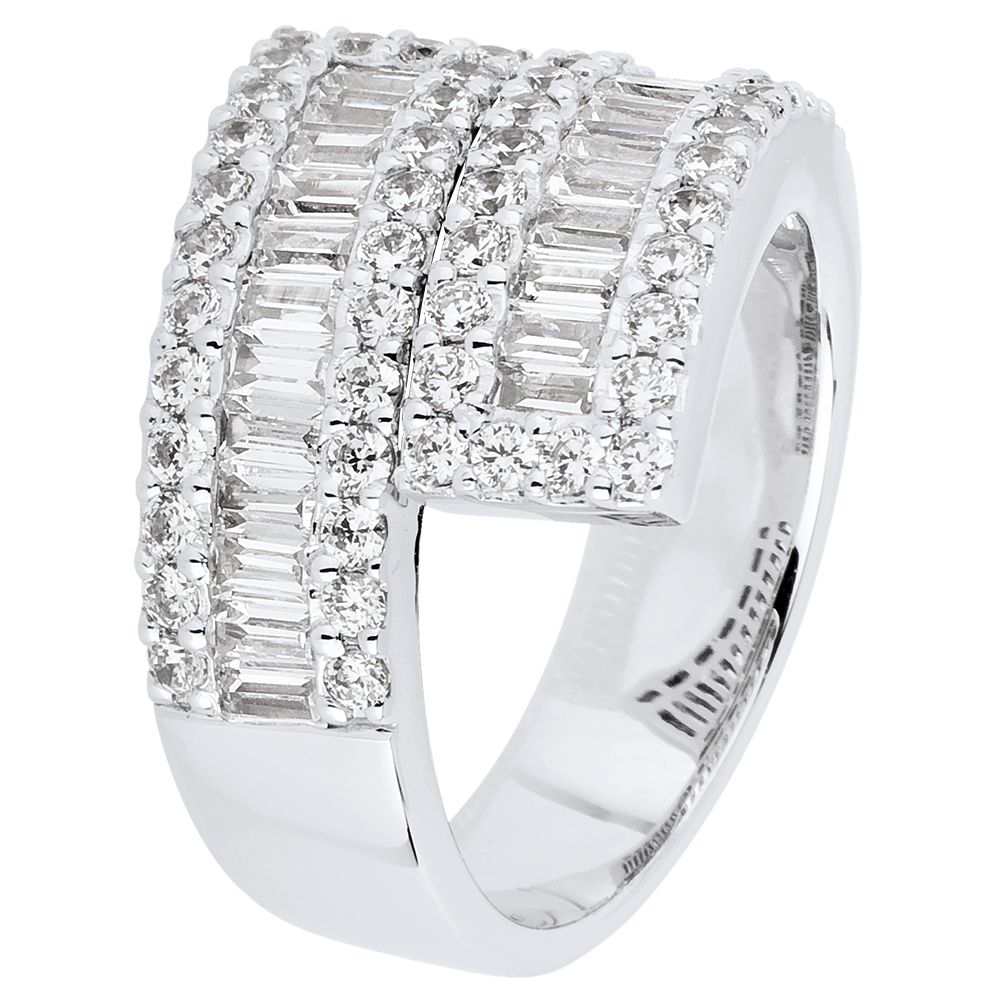 Three rows of diamonds, brilliant and lined on a sash for a rich and luxurious multi stone effect on white gold.