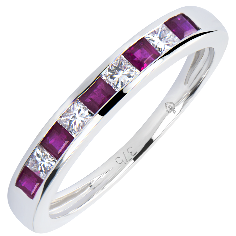 A white gold ring, semi-paved with sapphires and diamonds. A classic, timeless jewel with a touch of colour.
