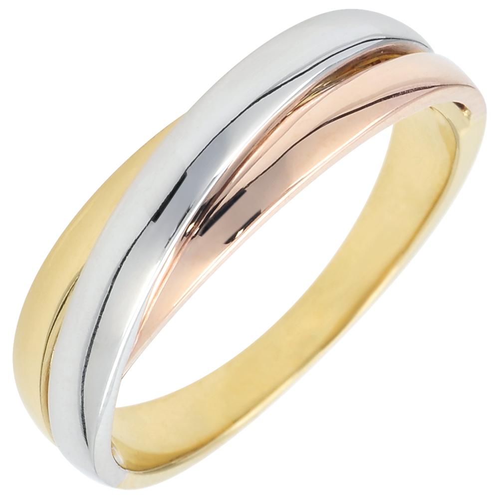 A trifoly of rings in 3 golds entwined and brought together for a wedding ring in motion and finesse. A wedding ring for men and women