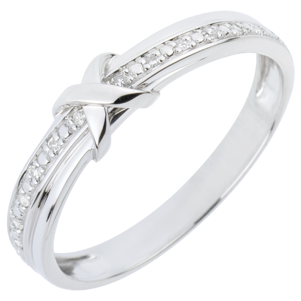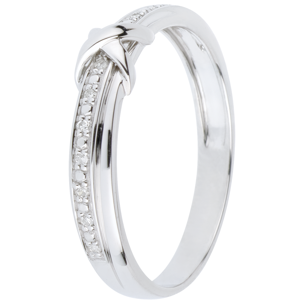 A white gold ring set with diamonds joined by a link in the shape of a symbol of love. A fine, elegant gold and diamond wedding ring.