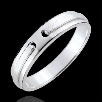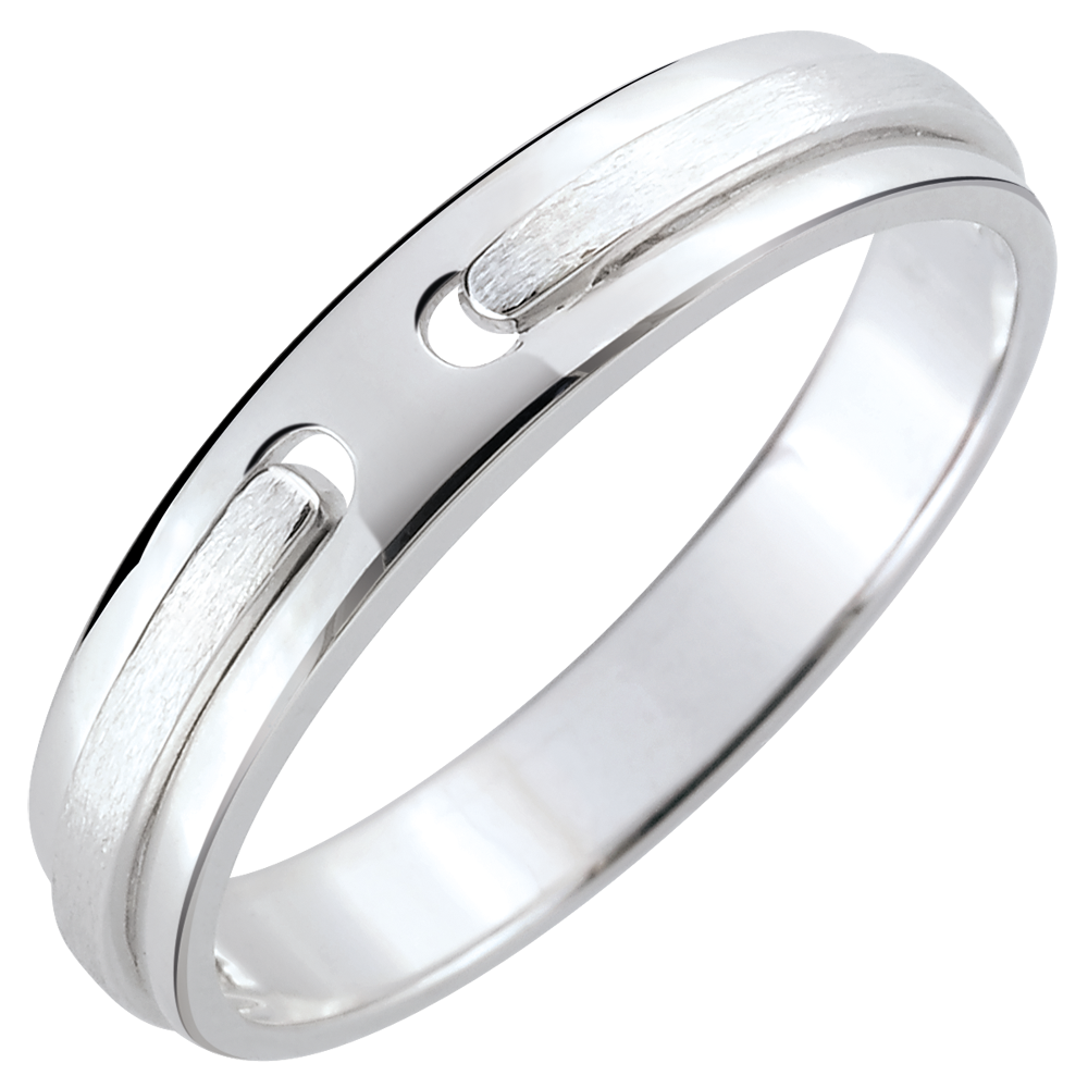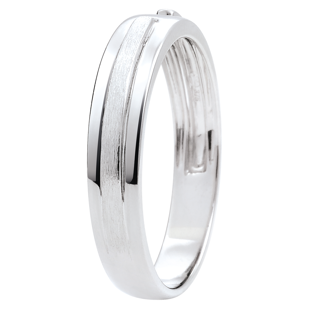 Two lines of brushed white golden are united as a promise of eternity in a bright ring. A wedding ring classic and unique, perfect to celebrate your marriage or commitment.