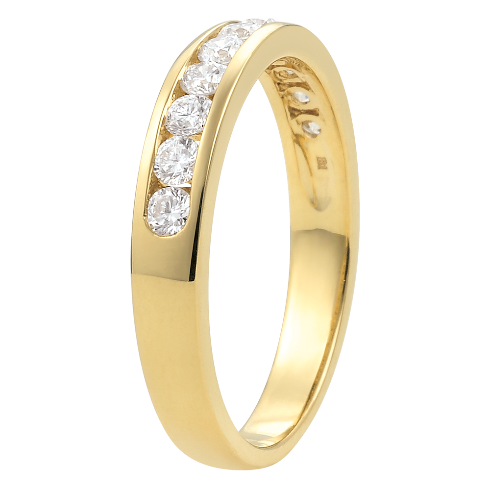 The perfect balance of a yellow golden ring with 11 round diamonds set on rails for a strong symbolism. A must jewel.