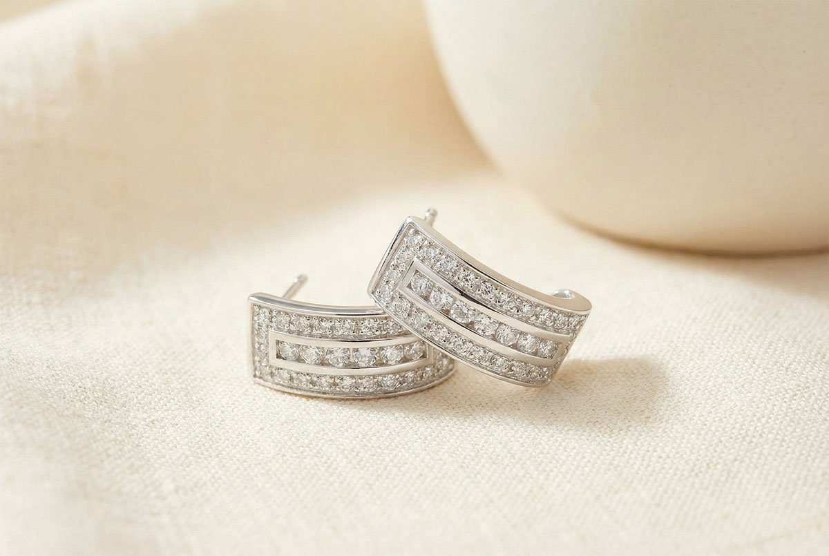 A line of brilliant cut diamonds are surrounded by smaller diamonds on white gold to form half-moon hoop earrings.
