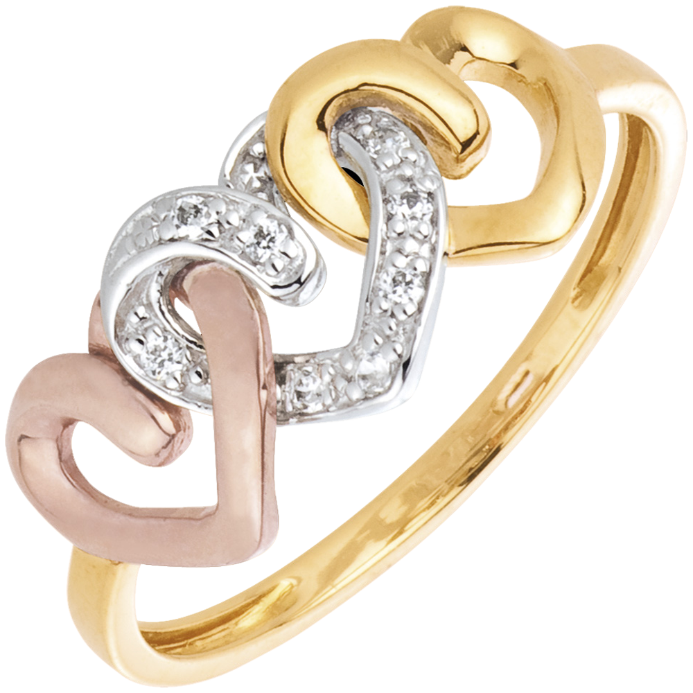 A yellow gold ring is held together by three hearts: one in yellow gold, one in pink gold and one in white gold which is paved with diamonds. A multi stone delight.
