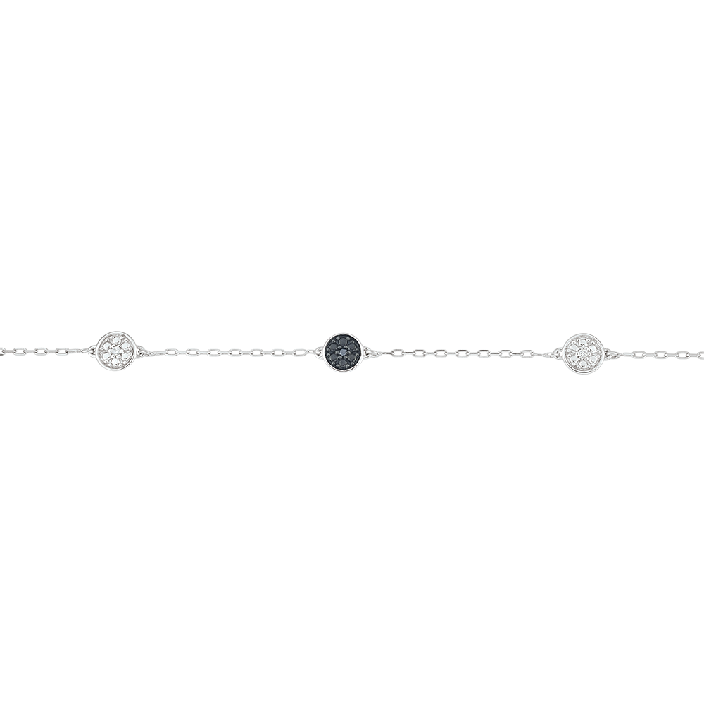 Alternating black and white motifs crafted in diamonds make the central diamonds twinkle like stars. An elegant and feminine Myriad bracelet. Bracelet with adjustable length: 18cm, 17cm, 16cm.Motif 5mm long and 5mm high. 2 diamonds : 0.01 carat - White gold (9K Gold = 375/-): 1.2 g. Diamond black : 2 - Diamond white : 2 - Total: 0.014 carat More dimensions