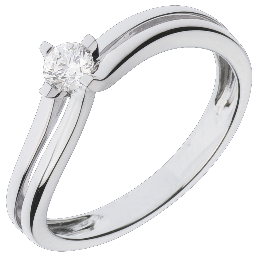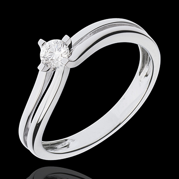 A white gold ring divides into a split shank to hold naked a dazzling solitaire.