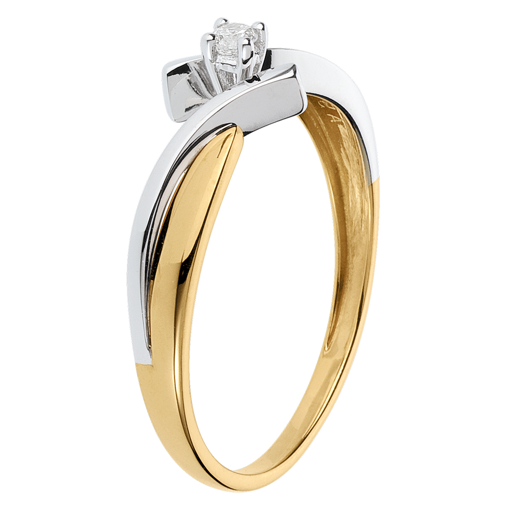 A diamond is held in the meeting point of a setting of two rings, in white and yellow gold.