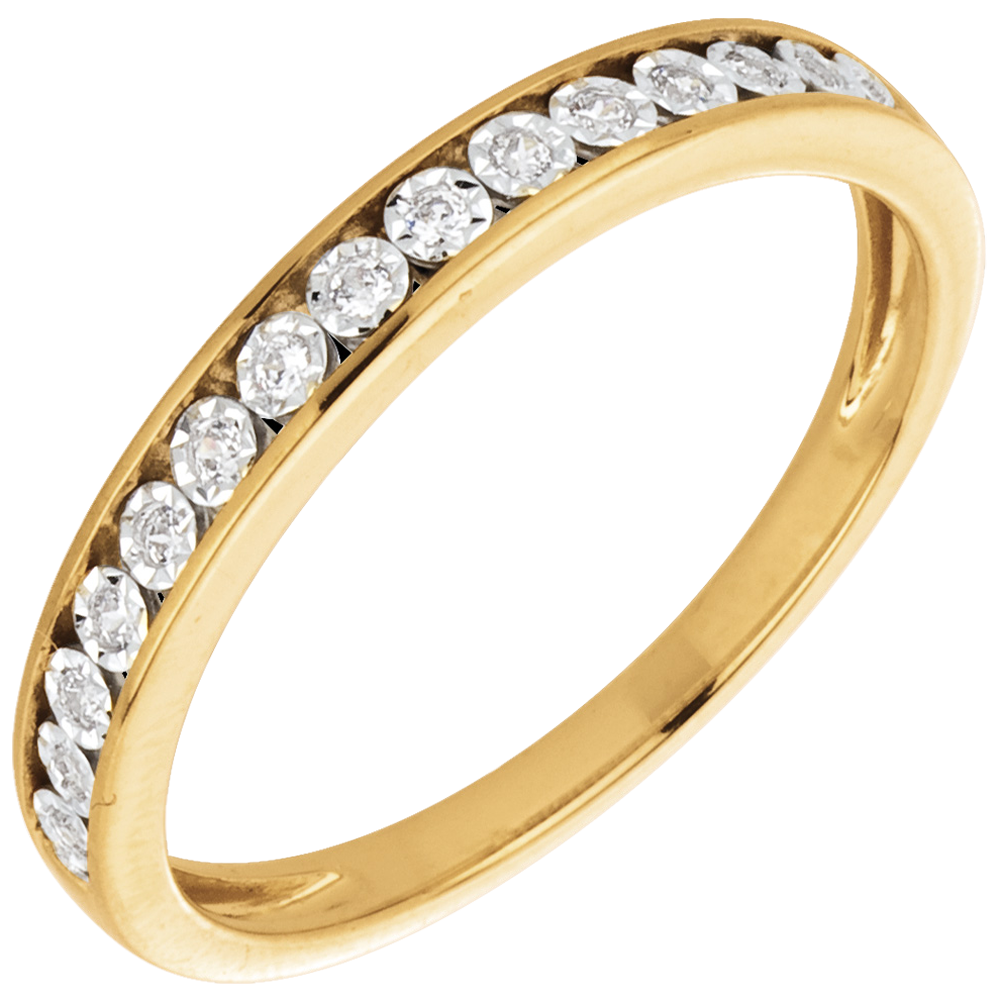 This yellow gold eternity ring has a white gold setting around the diamonds which amplifies the brilliance of the multi stone jewellery.15 Diamonds : 0.09 carat - Yellow gold (18K Gold = 750/-): 2.05 g. 15 diamonds : 0.09 carat - Yellow gold (18K Gold = 750/-): 1.9 g. More dimensions