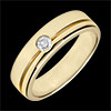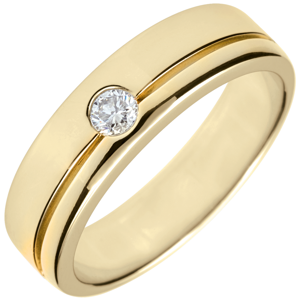 A wedding band with a grooved circumference and a diamond at its centre.
