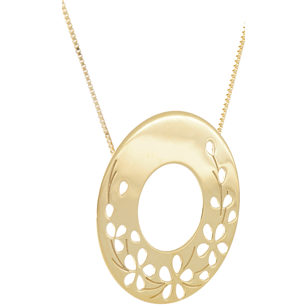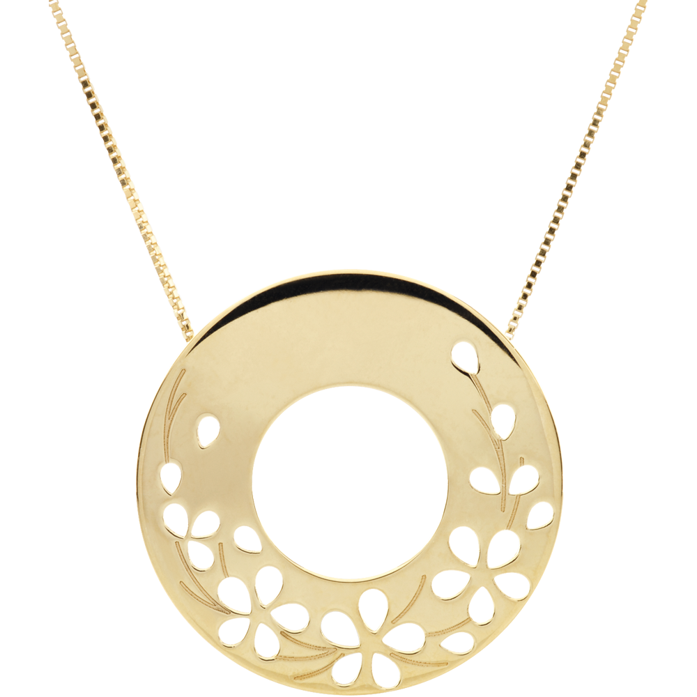 An apertured spring detail on a gold circle adds femininity and elegance to your neckline.